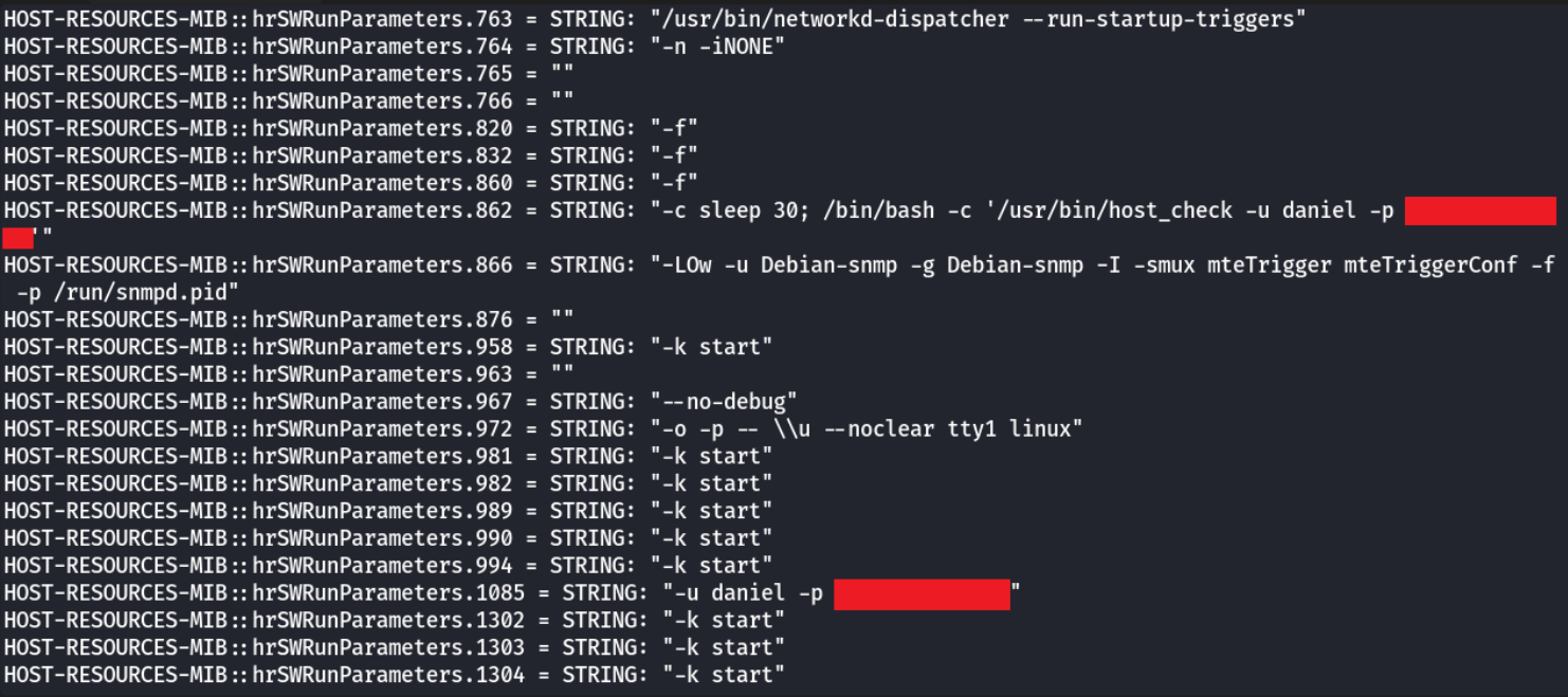 I found snmpwalk going through all OIDs being messy and taking some time, so I tailored my command to check OIDs individually and I found 1.3.6.1.2.1.25.4 to have a treasure: