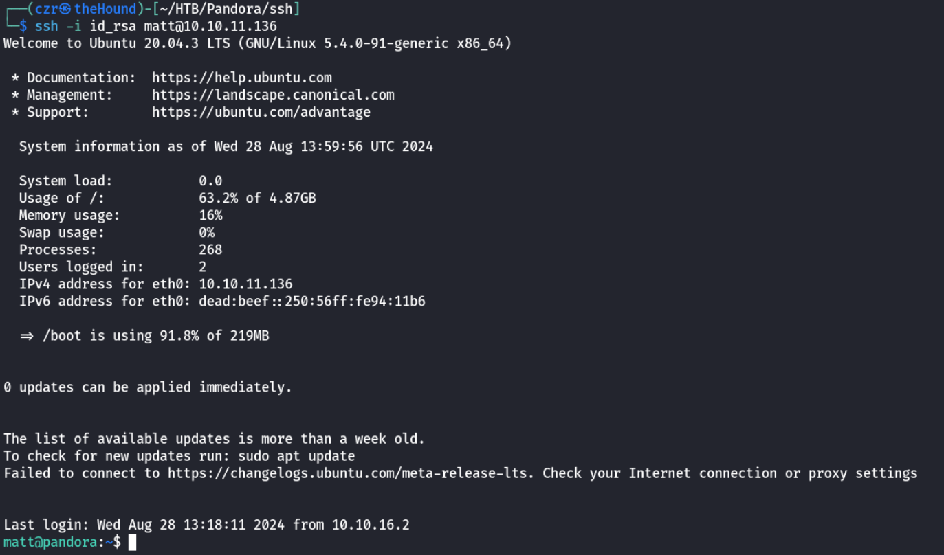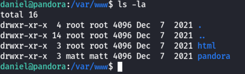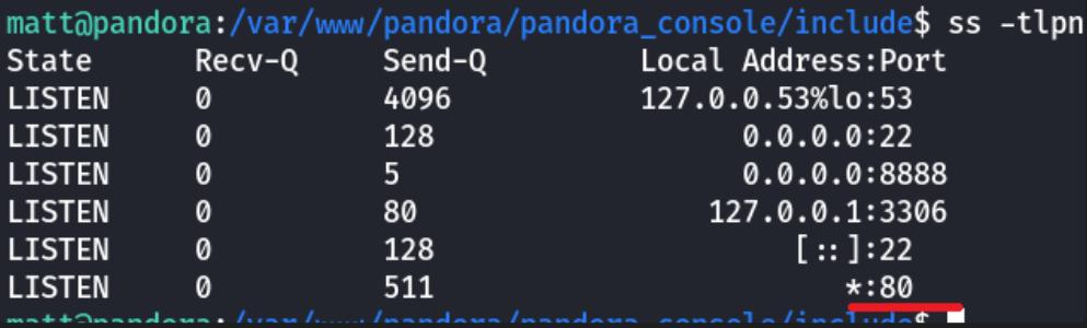 Hmm so this pandora folder is owned by matt. Let's check for internal ports ss -tlpn to see what's going on here: