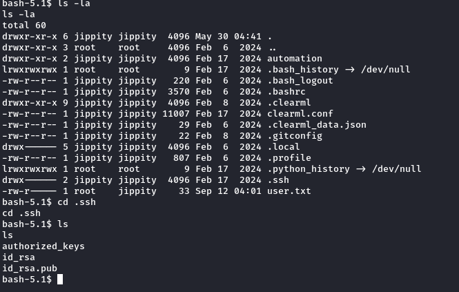 During enumeration on the target system, I found a .ssh folder containing an RSA key. I transferred this key to my local machine and used it to SSH into the machine as the user jippity.